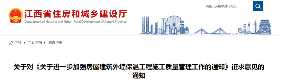 9月21日,江西省住建厅发布《关于对<关于进一步加强房屋建筑外墙保温工程施工质量管理工作的通知>征求意见的通知》,提出: